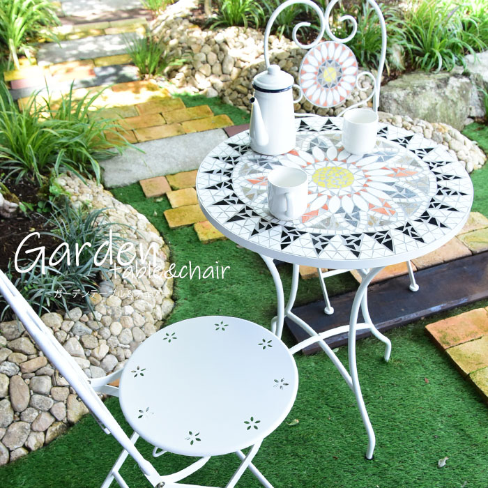 【 ガーデンテーブル タイル 3点セット 折りたたみ 幅60 ダイニングテーブルセット スチール ホワイト 可愛い おしゃれ 折りたたみチェアー 円形テーブル 丸テーブル テラス ガーデン椅子 コンパクト