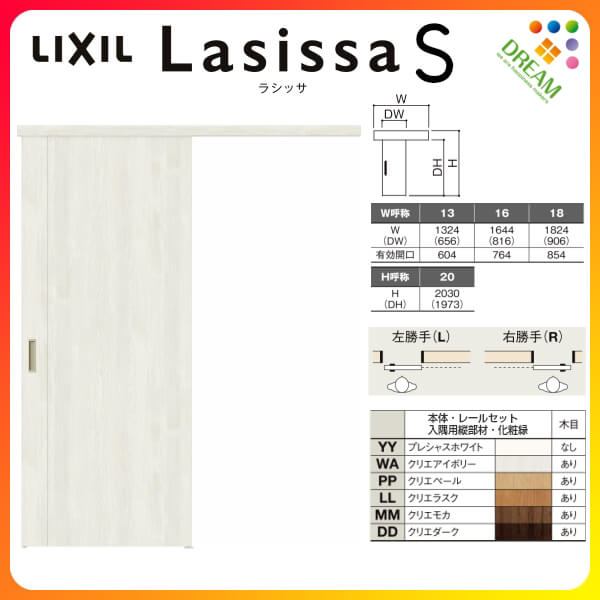 DIYに関する情報 必要技能:大工さん、建具屋さん 必要工具:電動ドリル、電動ドライバー、他 【商品説明】 【納まり図】 LIXIL/リクシルの室内建具 インテリアリビング建材 ラシッサ S ラシッサS(Lasissa S)はファミリーライン(FamilyLine)、ウッディーライン(WoodyLine)の後継商品シリーズで、合わせやすい色目に幅広くオーソドックスなインテリアをカバーするクリエカラーが特徴です。