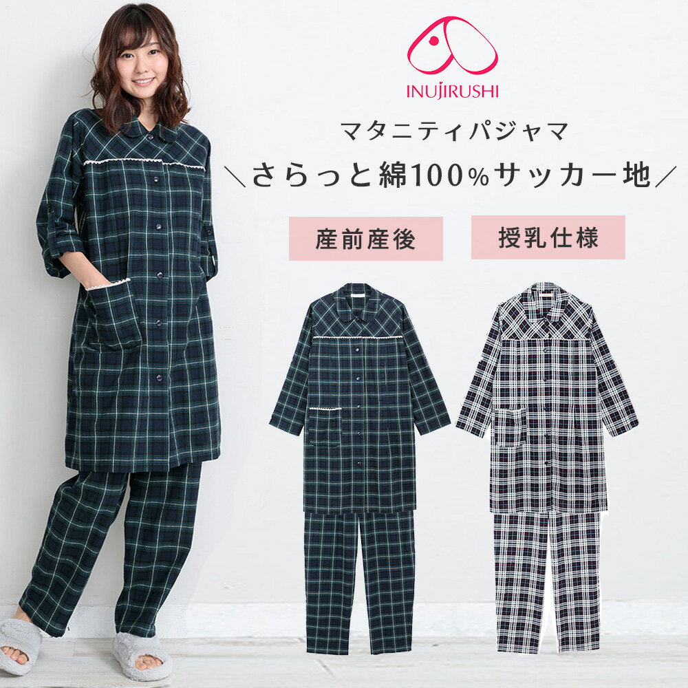 【送料無料】【あす楽】マタニティ パジャマ 綿100% ガーゼ チェック コットン ナイティ ロング丈 授乳に便利 前開き 長袖 授乳服 犬印 Fairy フェアリー マタニティー M L 入院 出産準備 産前 産後 あったか やわらか らくちん ゆったり ルームウェア 秋 冬