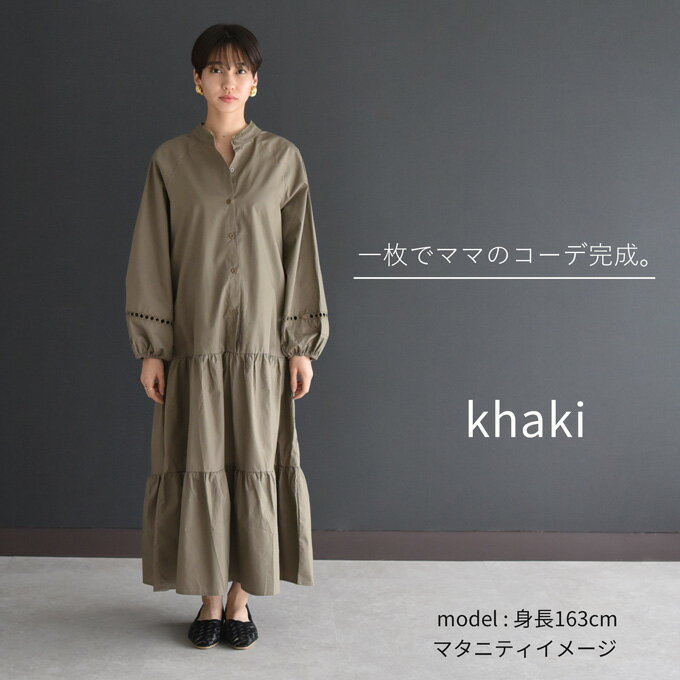ワイドなストレートラインに、スカート部分でふんわり広がるティアードフレアを切り替えた前開きシャツワンピースのご紹介。